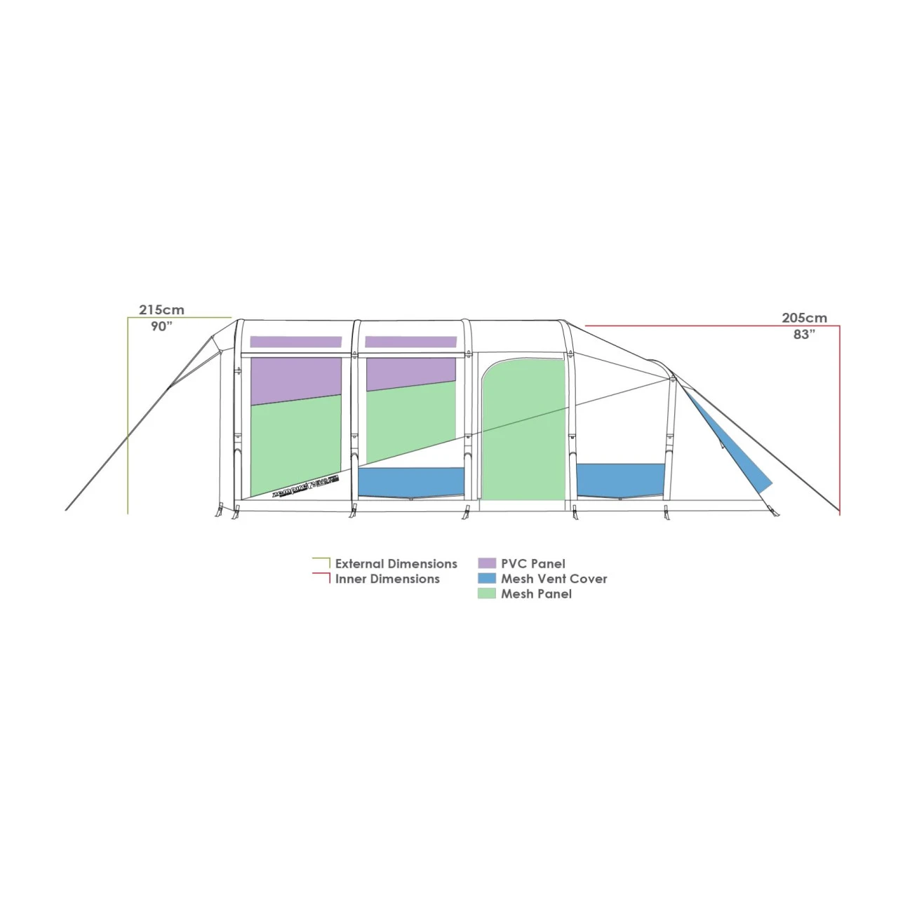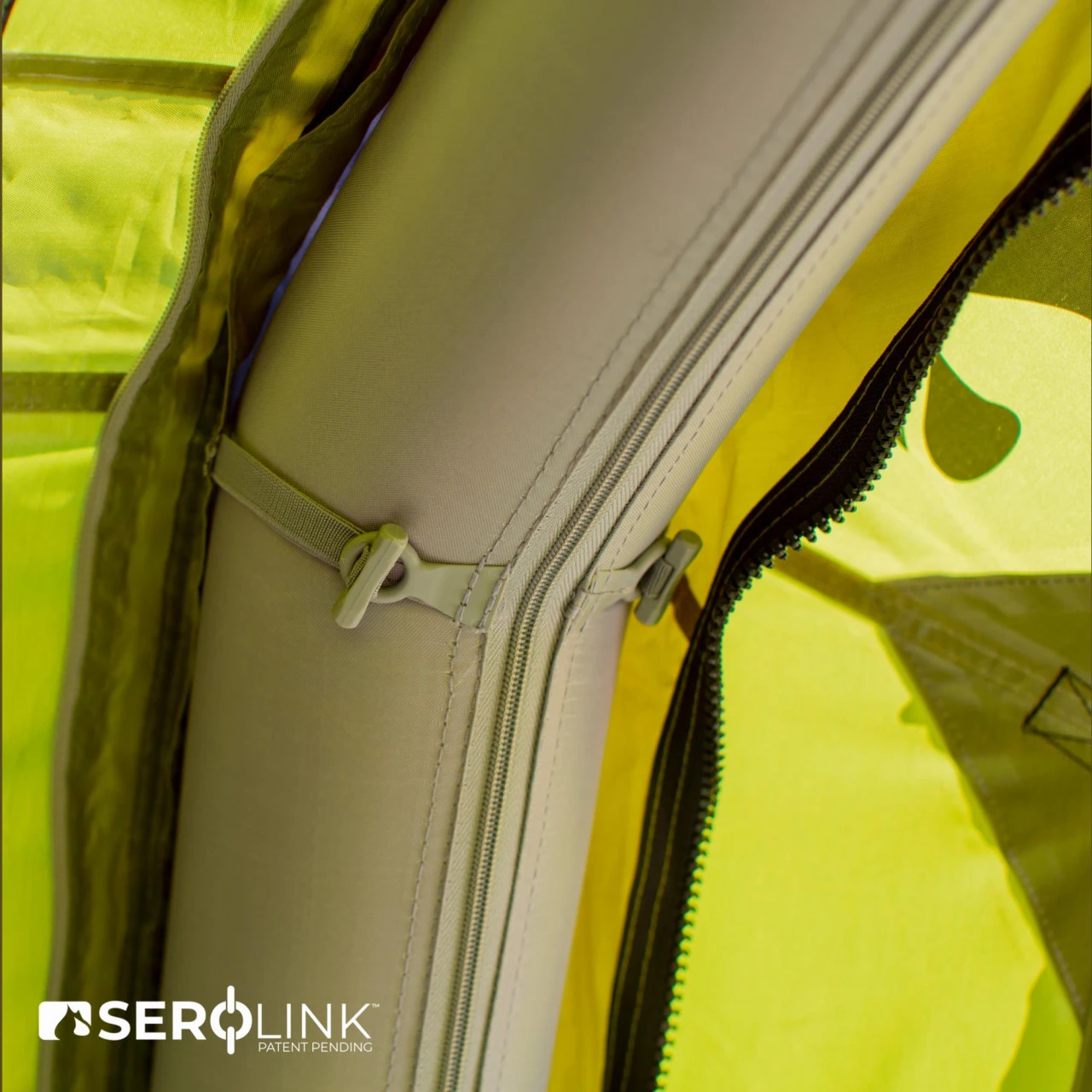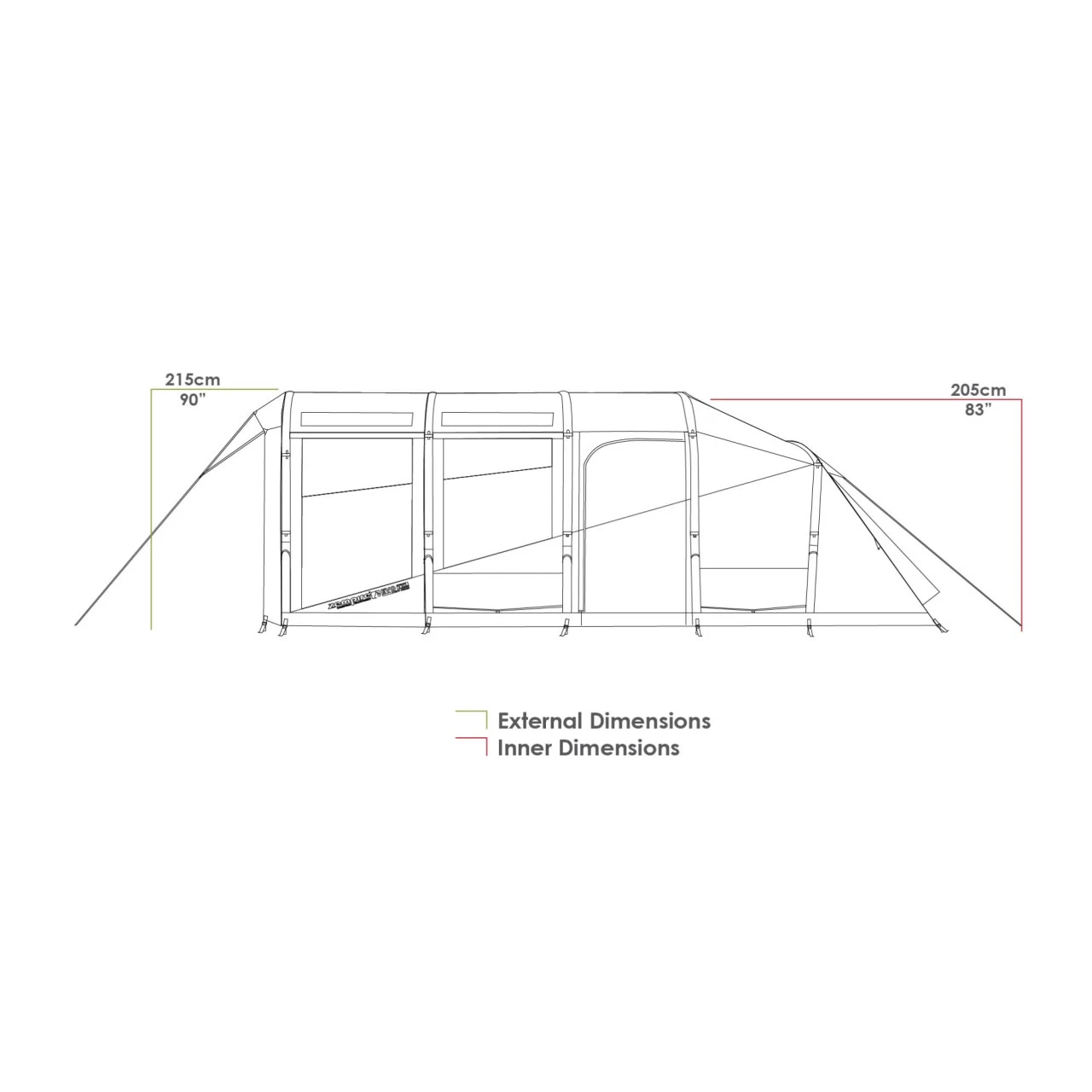 Das Zempire Evo TL V2 Familienzelt ist das ideale Einsteiger-Zelt für Paare oder kleinere Familien. Der große Vorraum, die PVC-Dachfenster und die hervorragende Belüftung machen das Evo TL V2 Familienzelt zu einem komfortablen Zelt. Ein lichtreflektierendes Material innerhalb der Schlafkabine sorgt für ungestörten Schlaf an Morgenden. Die abgewinkelte Balkenkonstruktion bietet verbesserte Windstabilität und Kopffreiheit im gesamten Zelt. Ein doppelwandiges Fenster erzeugt einen angenehm kühlen Luftstrom in warmen Nächten. Getönte PVC-Fenster bieten Privatsphäre im Zelt, ohne die Sicht einzuschränken. Dank dem aufblasbaren AirFrame System ist das Zelt im Handumdrehen auf- und abgebaut. Zusätzlich kommt die SeroLink Technologie zum Einsatz, die das Gestänge direkt mit dem Außenzelt verbindet. Dies sorgt nicht nur für ein Plus an Belastbarkeit und Flexibilität, sondern spart auch noch Gewicht. Darüber hinaus garantiert die abgewinkelte Konstruktion eine maximale Kopffreiheit. Das Außenzelt aus strapazierfähigem Oxford Polyester verfügt über getapte Nähte und bietet somit auch bei Starkregen zuverlässigen Wetterschutz.