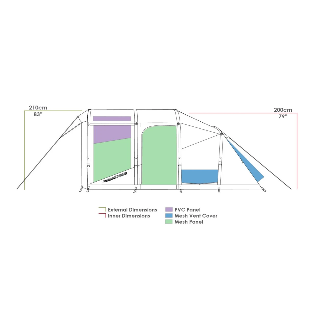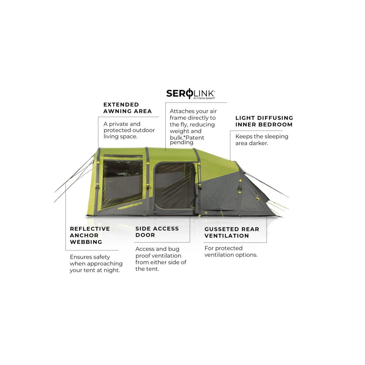 Das Zempire Evo TM V2 Familienzelt ist das ideale Einsteiger-Zelt für Paare oder kleinere Familien. Der große Vorraum, die PVC-Dachfenster und die hervorragende Belüftung machen das Evo TM V2 Familienzelt zu einem komfortablen Zelt. Ein lichtreflektierendes Material innerhalb der Schlafkabine sorgt für ungestörten Schlaf an Morgenden. Die abgewinkelte Balkenkonstruktion bietet verbesserte Windstabilität und Kopffreiheit im gesamten Zelt. Ein doppelwandiges Fenster erzeugt einen angenehm kühlen Luftstrom in warmen Nächten. Getönte PVC-Fenster bieten Privatsphäre im Zelt, ohne die Sicht einzuschränken. Dank dem aufblasbaren AirFrame System ist das Zelt im Handumdrehen auf- und abgebaut. Zusätzlich kommt die SeroLink Technologie zum Einsatz, die das Gestänge direkt mit dem Außenzelt verbindet. Dies sorgt nicht nur für ein Plus an Belastbarkeit und Flexibilität, sondern spart auch noch Gewicht. Darüber hinaus garantiert die abgewinkelte Konstruktion eine maximale Kopffreiheit. Das Außenzelt aus strapazierfähigem Oxford Polyester verfügt über getapte Nähte und bietet somit auch bei Starkregen zuverlässigen Wetterschutz.